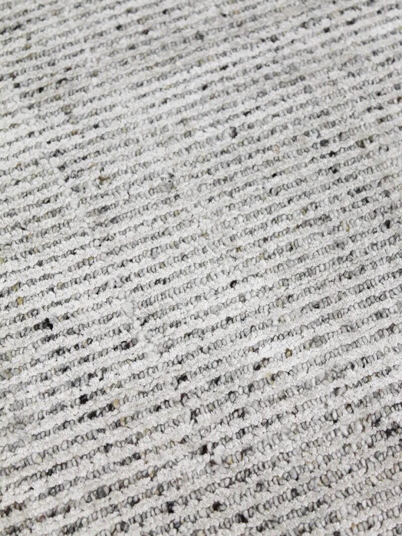 Contemporary speckle rug in neutral hues. Handloom knotted in contrasting wool loop-pile and luminous artsilk cut-pile weave. Ideal for high foot traffic areas and family living.